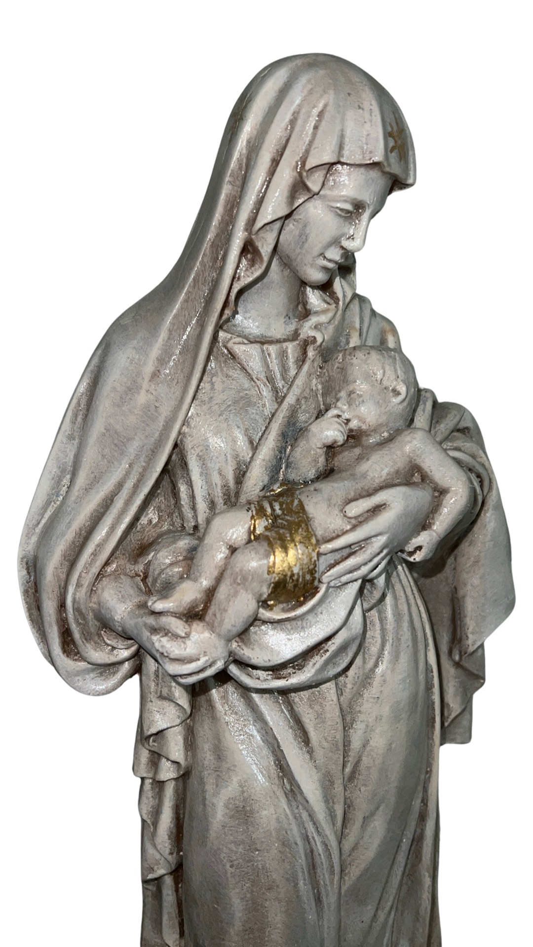 Esta interpretación se inspira en el tono blanco del original con detalles en dorado en el pañal del niño y al rededor de la cabeza de la Virgen.